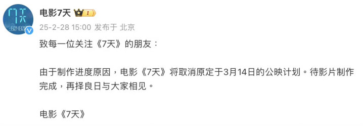 《7天》撤档啦,原本定在 2025 年 3 月 14 日上映,这下好了,无数眼巴巴盼着的观众只能空欢喜一场。片方给出的理由是“制作进度原因”,声称要更多时间搞后期制作,特别是特效镜头和整体制作细节。这话说得冠冕堂皇,可真就这么简单?